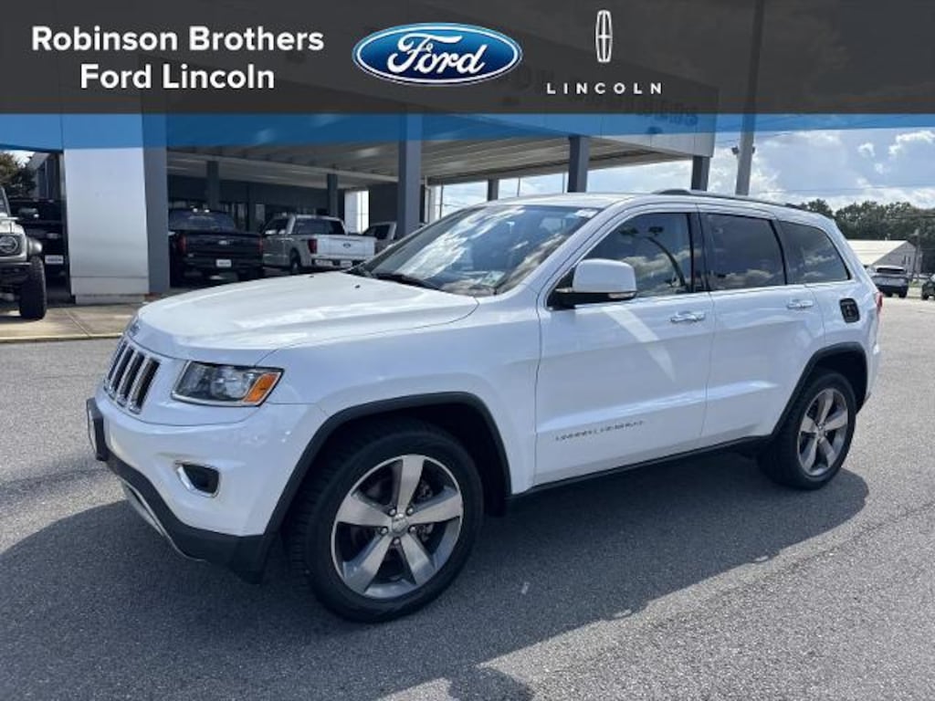 Bright White Clearcoat 2014 Jeep Grand Cherokee Limited RWD 8-Speed Automatic 3.6L V6 Flex Fuel 24V VVT<br><br>Recent Arrival!<br><br>Awards:<br> * 2014 IIHS Top Safety Pick<br><br>Robinson Brothers Ford Lincoln specializes in one owner lease returns and trade in vehicles - not cars from rental companies! We believe it is a much better value for your money to purchase a one owner lease return or a customer trade-in as opposed to rental units that have not been taken care of! We offer a complimentary vehicle history report on all of our vehicles! Buy with confidence! Quick Order Package 23H (9 Amplified Speakers w/Subwoofer and Cargo Compartment Cover) 10 Speakers 18' x 8.0' Aluminum Polished Wheels 20' x 8.0' Aluminum Wheels 3.45 Rear Axle Ratio 4-Wheel Disc Brakes 8.4' Touchscreen Display ABS brakes Air Conditioning Alloy wheels AM/FM radio: SiriusXM Anti-whiplash front head restraints Audio memory Auto-dimming door mirrors Auto-dimming Rear-View mirror Automatic temperature control Body Color Exterior Mirrors Brake assist Bumpers: body-color Compass Delay-off headlights Driver door bin Driver Power Memory/Passenger Man. Fold Flat Seat Driver vanity mirror Dual front impact airbags Dual front side impact airbags Eco Suspension I Electronic Stability Control Exterior Parking Camera Rear Four wheel independent suspension Front anti-roll bar Front Bucket Seats Front Center Armrest w/Storage Front dual zone A/C Front fog lights Front reading lights Fully automatic headlights Garage door transmitter GPS Antenna Input Heated door mirrors Heated front seats Heated rear seats Heated steering wheel Illuminated entry Integrated Voice Command w/Bluetooth Knee airbag Leather Shift Knob Low tire pressure warning Manufacturer's Statement of Origin Memory seat Nav-Capable! See Dealer for Details Occupant sensing airbag Outside temperature display Overhead airbag Overhead console Panic alarm Passenger door bin Passenger vanity mirror Power door mirrors Power driver seat Power Liftgate Power passenger seat Power steering Power windows Premium Leather Trimmed Bucket Seats Radio data system Radio: Uconnect 5.0 AM/FM/BT Radio: Uconnect 8.4A AM/FM/SXM/BT(Consumer) Rear anti-roll bar Rear reading lights Rear seat center armrest Rear window defroster Rear window wiper Rear-View Auto-Dimming Mirror w/Microphone Remote keyless entry Roof rack: rails only Security system SIRIUSXM Satellite Radio Speed control Speed-Sensitive Wipers Split folding rear seat Spoiler Steering wheel mounted audio controls Tachometer Telescoping steering wheel Tilt steering wheel Traction control Trip computer Turn signal indicator mirrors Uconnect Access and Variably intermittent wipers.<br><br>Reviews:<br> * If you are on the prowl for an American-made 5-passenger SUV with high-style and genuine off-road chops the 2014 Jeep Grand Cherokee is a solid choice. Thanks to an alluring new array of in-vehicle electronics the Grand Cherokee is also one of the most technologically advanced entrants in the category. Source: KBB.com<br> * Strong and fuel-efficient engine lineup including a new diesel V6; upscale interior; plenty of luxury and technology-oriented features; irrefutable off-road ability; outlandish SRT model. Source: Edmunds